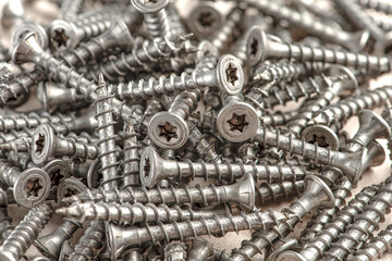 Close-up of universal silver screws with torx head. Self-tapping screws for wood, plywood or chipboard. Torx screws close up.