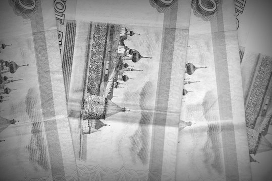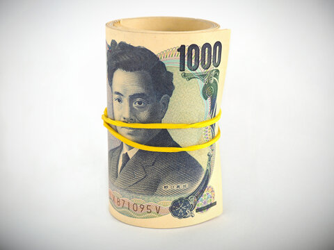 A bundle of Japanese 1000 yen bills stands on a white paper background. Banknotes are rolled up and tied with an elastic band. Roll of money. Vignetting frame applied. Bank deposit or loan. Macro