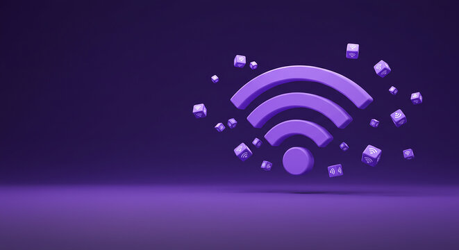 Purple wifi symbol surrounded by cubes with wifi symbol on purple background
