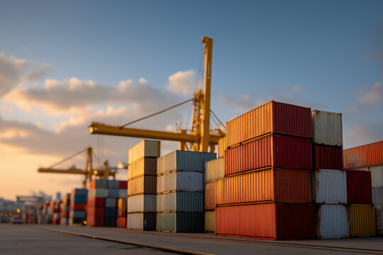 Towering container cranes silhouetting port at sunset golden hour with vessels and gulls