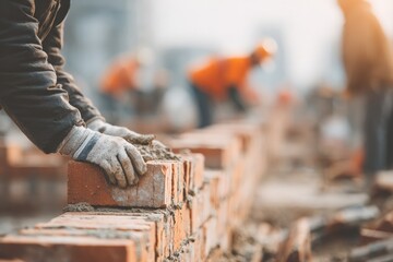 Construction worker laying bricks to build a wall on a construction site, with other workers blurred in the background