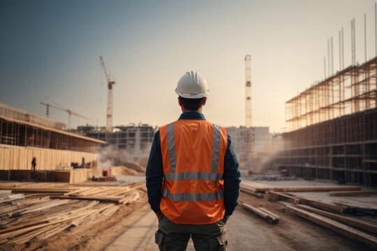 Diverse Team of Specialists Inspect Commercial, Industrial Building Construction Site. Real Estate Project with Civil Engineer, Investor and Worker. In the Background Crane, Skyscraper Formwork Frames
