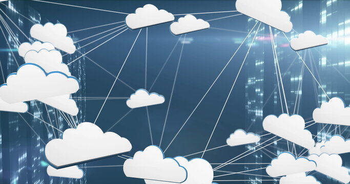 Image of clouds connected with lines, lens flare, falling bars against blue background