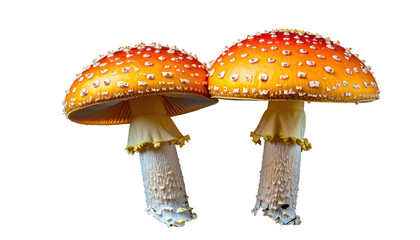 Two vibrant, spotted mushrooms with orange caps and white stems