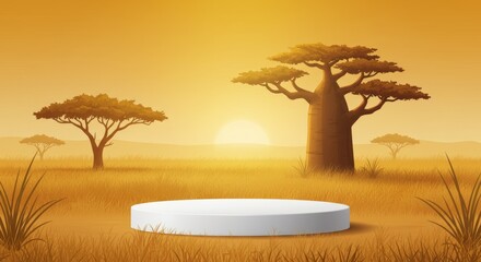 Savanna sunset product display with baobab trees and white podium stage