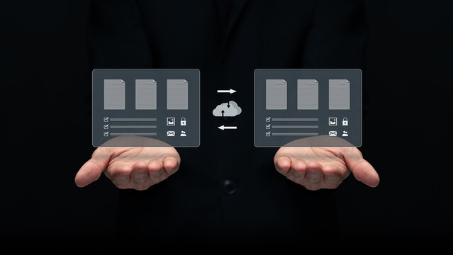 Cloud technology and Transfer file data system relocation or file sharing services concept. security access to backup copy database, business document storage folder, upload, download, file management