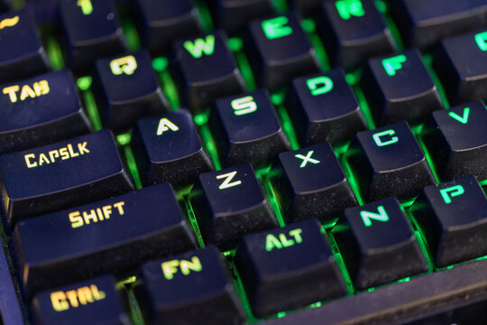 Mechanical keyboard with RGB LED backlight. Keyboard keys close-up. Soft Selective Focus