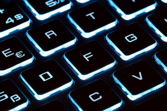 Gaming laptop computer keyboard with backlit keys. Low angle, shallow depth of field.