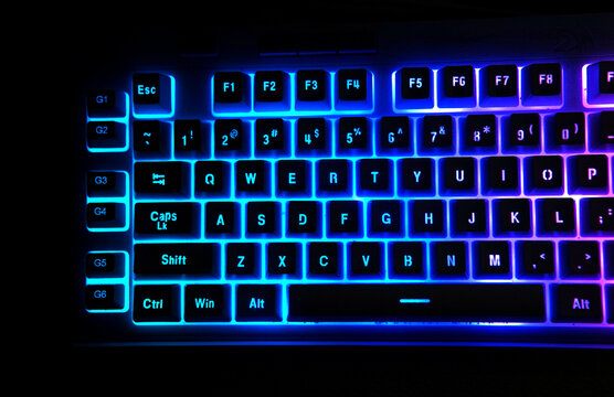 Close up of a laptop keyboard with illuminated blue backlighting visible