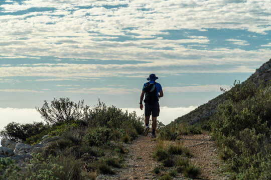 Silhouette of a hiker walking along a path, with blue cloudy sky  in the background.