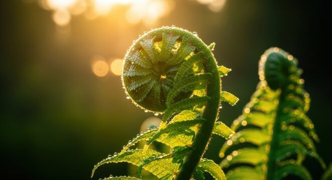 Sunlight illuminates a spiral fern leaf covered in morning dew