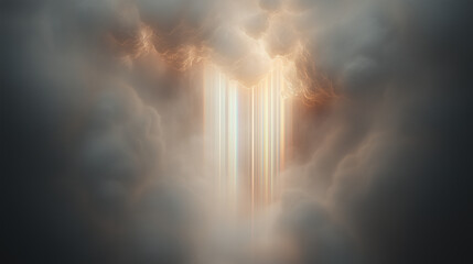 Dramatic glowing light beams descending from storm clouds with orange lightning and mist, fantasy or divine concept background