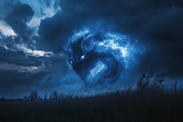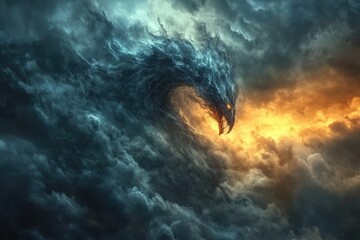 Storm clouds forming mythical creatures with dramatic backlighting composition and rule of thirds on time-lapse blend