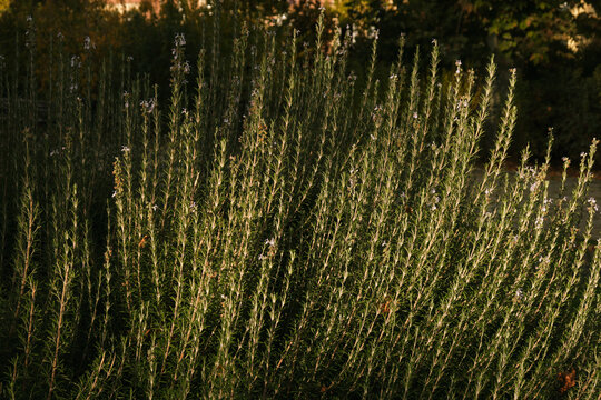 Golden backlit wild grasses and slender shrub stems glow in warm evening light, creating textured layers of foliage, shadows, and delicate seed heads in a tranquil natural scene.