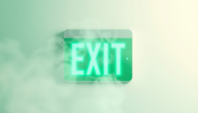 Glowing green EXIT sign surrounded by heavy smoke in emergency evacuation setting