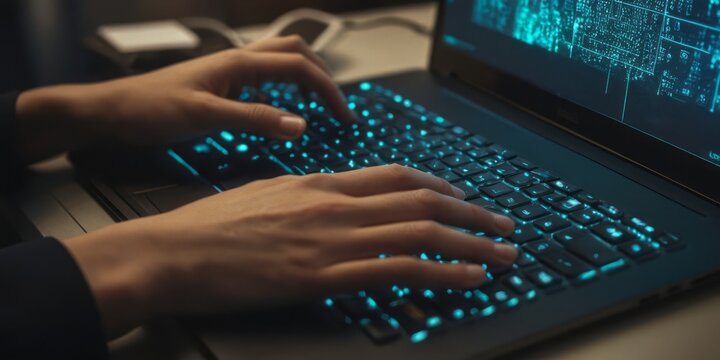 A person's hands are typing on a laptop keyboard, illuminated by the blue glow of the keys
