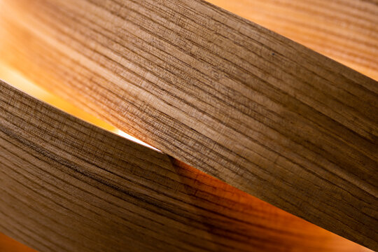 A close-up of a room lamp made of veneer strips. The object is illuminated by atmospheric light