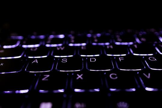 Hand hovering over illuminated blue purple backlit keyboard futuristic cyber tech concept