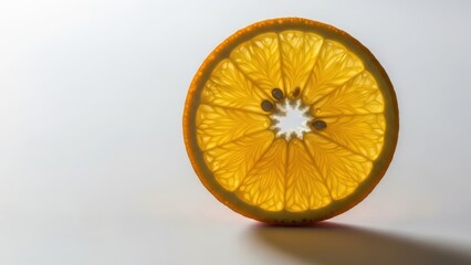 A backlit, translucent orange slice standing upright on a white surface, showcasing its vibrant color and intricate internal structure with seeds.