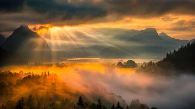 Golden Hour Rays Over Misty Mountain Ridges
