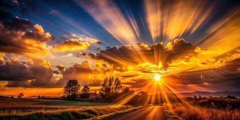Golden sunbeams streaming through hazy sky with soft bokeh glow and rays