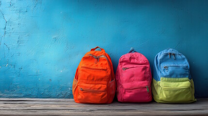Three colorful backpacks in vibrant orange, pink, and blue are arranged on a rustic wooden surface against a textured blue wall, showcasing stylish school accessories for students