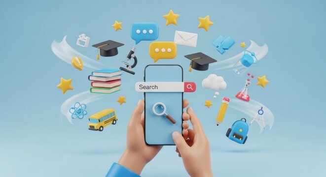 Engaging digital education concept with playful cartoon elements on smartphone screen