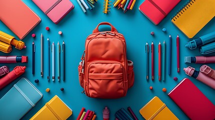 A top view of a backpack surrounded by school supplies like pencils, markers, and notebooks, forming a circular pattern with clear copy space in the middle.