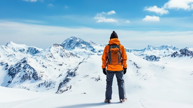Hiker with backpack and trekking poles standing on a snow covered mountain peak, looking at a vast winter landscape under blue sky