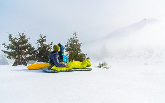 Backpacker Exploring Snow Covered Mountain Landscape Images