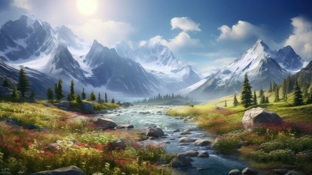 The image is of a beautiful mountain landscape. The mountains are covered in snow. The river is flowing through the valley.