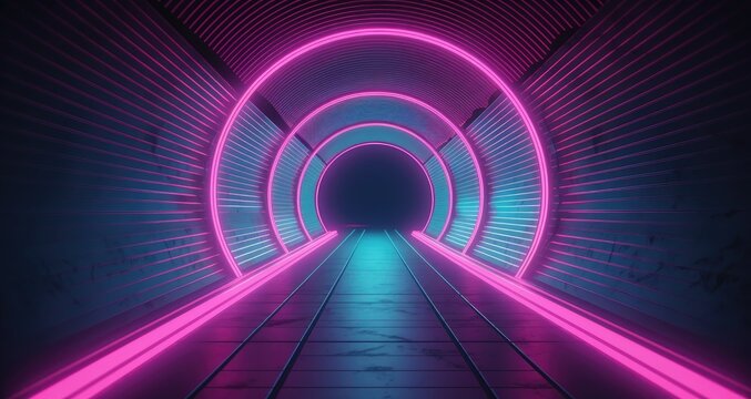 Futuristic colorful cyberpunk glowing light through the tunnel background. Generative AI