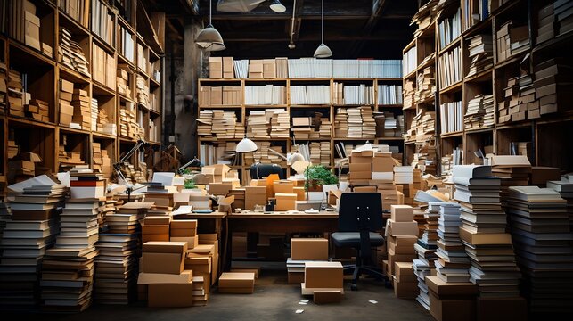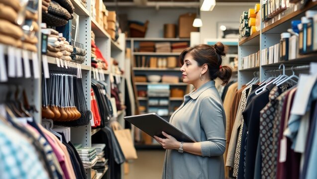 A female shop owner managing inventory in a backroom while staff attend to customers Her hands-on involvement highlights her commitment to her business A grounded depiction of women in retail manageme