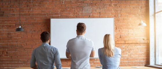 Three people, two men and a woman, standing in front of a large whiteboard in a room with brick walls. they are facing the whiteboard and appear to be in the middle of a presentation.