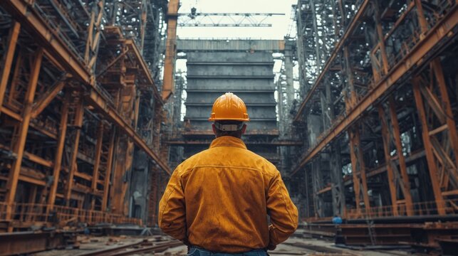 A construction worker in a yellow jacket and helmet stands with his back to the camera, observing a large industrial site.
