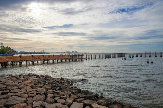 Sea landscape with unfinished piers