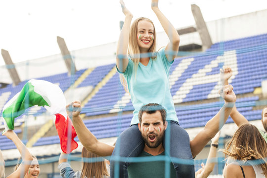 Diverse group of enthusiastic sports fans celebrating victory indoors