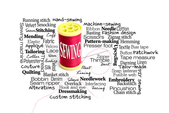 Sewing Word Cloud or Sewing related activity with sewing label on body of a crimson red standing quilting thread