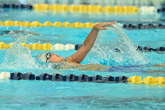 Athletic swimmer exhibiting powerful stroke in indoor pool