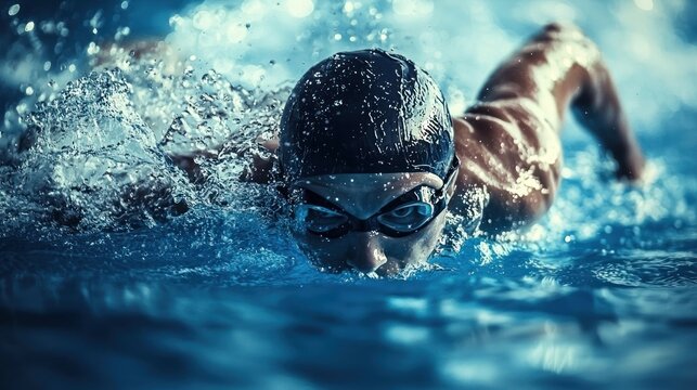 Dynamic water splash from swimmer making sharp turn in clear pool water. Motion blur captures athlete speed, power during freestyle or backstroke technique. Summer swim session creates ripples, waves.