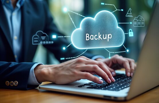 Businessperson interacts with futuristic virtual cloud backup interface on laptop. Person types on laptop computer. Hologram cloud network shows backup data security system. Focus on tech solutions,