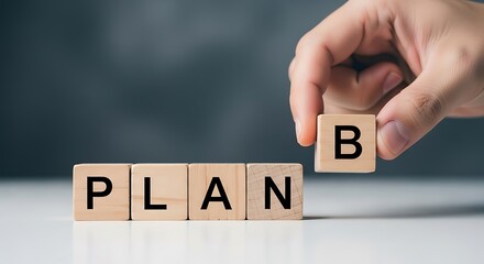 Hand placing wooden block with letter b to complete the word plan b, representing backup plan