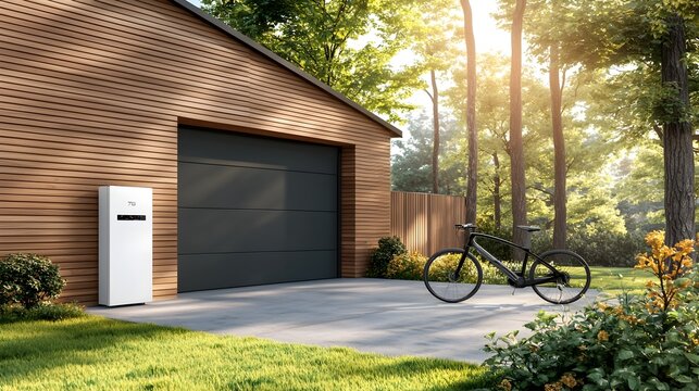 Contemporary home energy battery pack installed in a modern garage showcasing sustainable electric power storage and backup systems for an eco conscious household