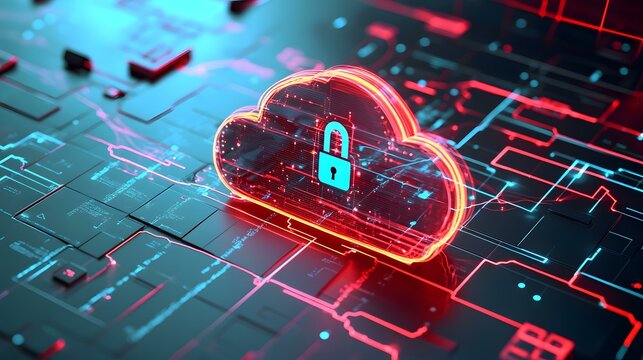 Futuristic tech scene shows cloud computing. Big data transfer on internet. Digital network connection. Modern server room. Data storage system. Innovative tech. Cybersecurity. Global connection.