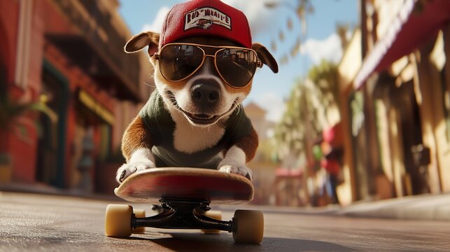 A dog riding a skateboard with a determined look, wearing a backward baseball cap and shades, zooming down a street