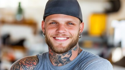 Smiling tattooed man in casual attire with a backward cap inside a trendy coffee shop with warm lighting and artistic decor
