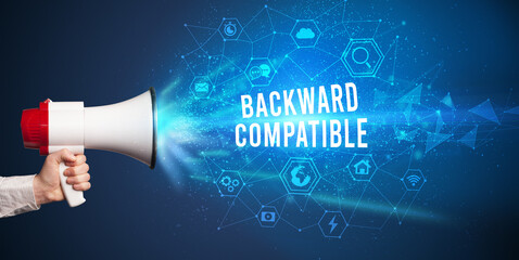 Man hand holding BACKWARD COMPATIBLE inscription, technology concept