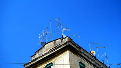Numerous antennas and TV dishes on an ancient building, typical of many Italian cities. conceptual image for technological backwardness
