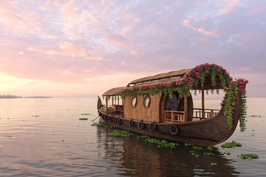 A beautifully decorated houseboat floats gently on the calm waters during a breathtaking sunset casting a warm glow across the serene Kerala backwaters on a festive occasion
