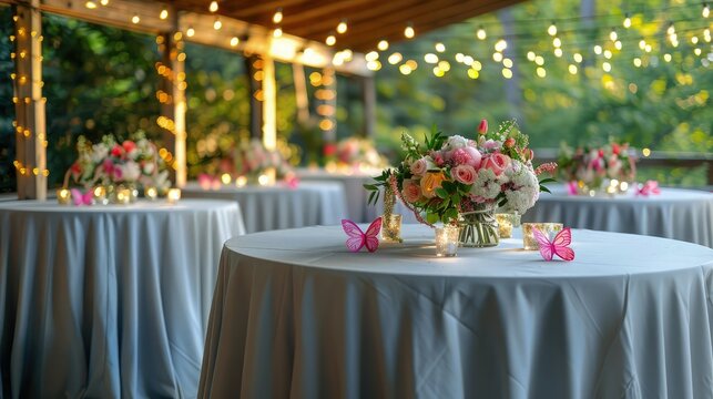 An outdoor corporate event setting under string lights, with tables covered in light grey linens, pink butterfly accents fluttering around the floral centerpieces.